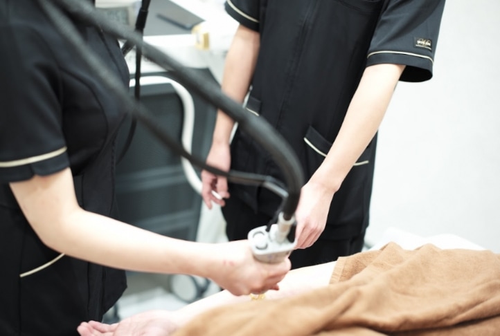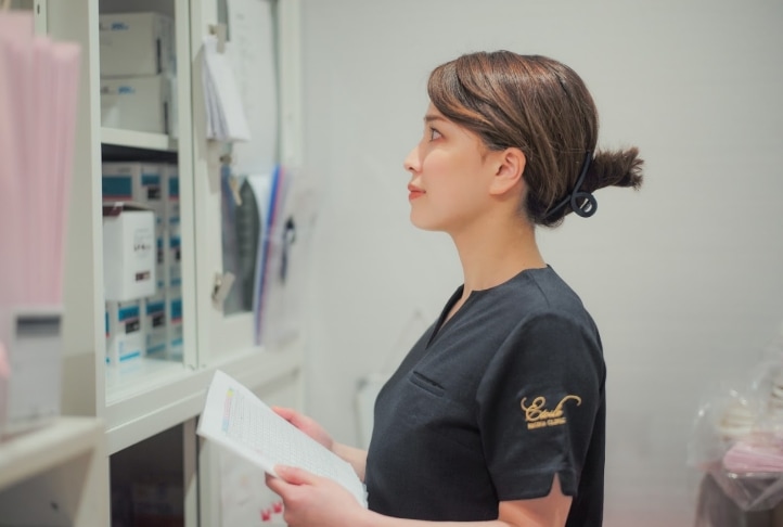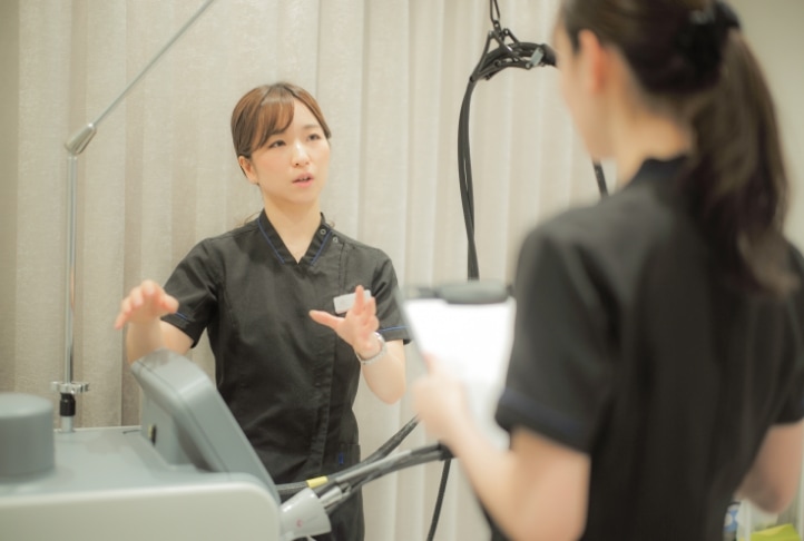 先輩看護師の介助からはじまり、全身照射が一通りできるようになったら、お顔・VIOと進んでいきます!1件ずつ施術の振り返りを行い、技術の向上を目指していきます。